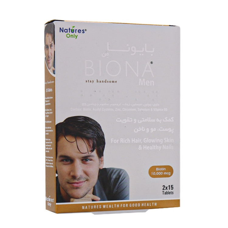 سلامت پوست، مو و ناخن تاثیر زیادی در زیبایی فرد دارد. به همین دلیل، حفظ این سلامت برای اکثر افراد بسیار مهم است. قرص Nature’s Only BIONA Man با ترکیبات موثر و با تمرکز بر سلامت پوست، مو و ناخن مردان فرموله و به بازار عرضه شده است. My BIONA یک قرص پوشیدنی است که ریزمغذی های ضروری برای رشد مو و ناخن را فراهم می کند. وجود ویتامین هایی مانند بیوتین و اسید پانتوتنیک اثر آنتی اکسیدانی دارد و به متابولیسم کربوهیدرات ها کمک می کند و از ساختار مو، پوست و ناخن ها حمایت می کند.