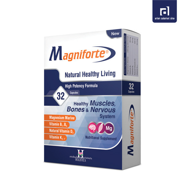کپسول مگنیفورت هولیستیکا موجب سلامت و بهبود عملکرد اعصاب و عضلات میشود و با افزایش توده و استحکام استخوانها از دردهای عضلات و مفاصل پیشگیری مینماید. کپسول ®Magniforte در تنظیم فشار خون و قند خون و تنظیم ضربان قلب نیز موثر است. حملات میگرنی و سردرد را کاهش میدهد و همچنین موجب کاهش دردهای ناشی از بیماریهای سیستم اعصاب و کاهش یبوست میشود.