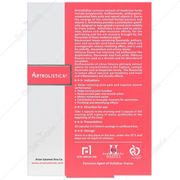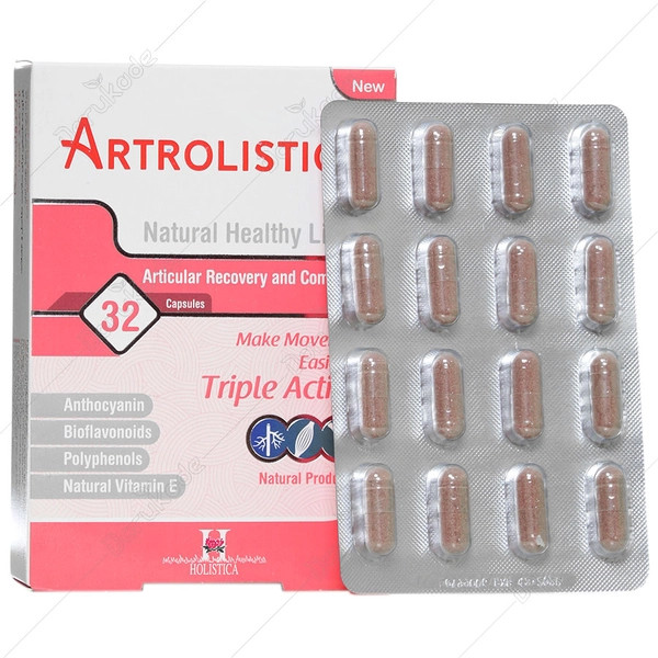 آرترولیستیکا فرآورده طبیعی شرکت آرین سلامت سینا و تحت برند شرکت Holistica فرانسه بوده و با بهره گیری از عصاره گیاهانی نظیر برگ انگورفرنگی سیاه و چای ترش در کنار بیوفلاونوییدهای لیمو و ویتامین E، مجهز به خواص آنتی اکسیدانی و ضد التهابی قوی و فواید سلامت بخش چند جانبه ای گشته است. آرترولیستیکا برای محافظت و کاهش درد و التهاب مفاصل، تسهیل حرکات و کمک به ریکاوری و ترمیم عضلانی پس از ورزش فرموله شده؛ ضمن اینکه قادر به پاکسازی سموم بدن است. آرترولیستیکا به فرم دارویی کپسول در جعبه های 32 عددی (2 بلیستر 16تایی) به بازار عرضه شده است اما در اصطلاح متداول به آن قرص آرترولیستیکا هم می گویند.