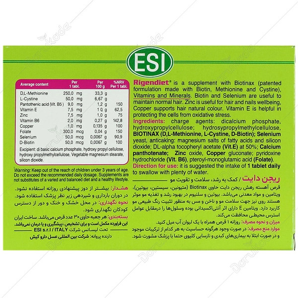 ریجن دایت، مکمل تغذیه ای به شکل دارویی قرص آهسته رهش است که برای کمک به سلامت، رشد و تقویت مو کاربرد دارد. ریجن دایت حاوی متیونین، سیستئین، ویتامین های E ،B5 ،B6 ،B9 و بیوتین در کنار مواد معدنی همچون زینک، سلنیوم و مس است و علاوه بر کمک به تأمین نیاز بدن به این ریزمغذی ها و جلوگیری یا رفع کمبود، به کنترل و بهبود ریزش مو و محافظت از سلول ها در برابر استرس های محیطی با اعمال اثرات آنتی اکسیدانی نیز کمک می کند. ریجن دایت اسی در جعبه های مقوایی 30 عددی شامل 2 بلیستر 15 تایی تحت لیسانس ESI s.r.l ایتالیا و توسط شرکت بین المللی عسل دارو کیش در ایران تولید می شود.