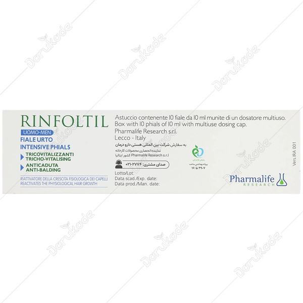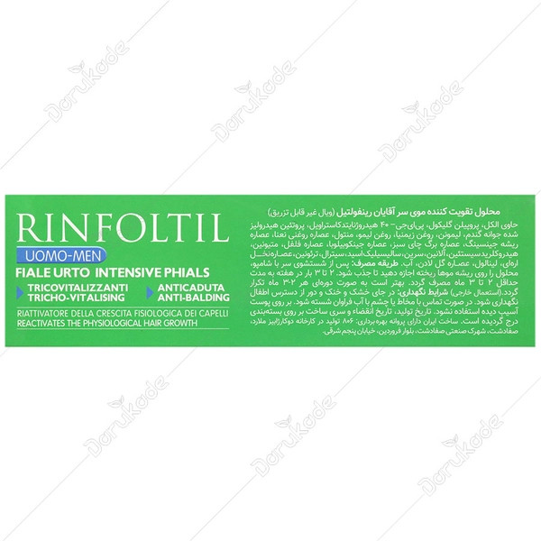 ویال رینفولتیل مردانه یک محصول تخصصی برای کمک به رویش مجدد و کنترل ریزش مو در مردان می باشد. رینفولتیل مردانه یک محصول سرشار از مواد مغذی و ترکیبات طبیعی می باشد. فرمولاسین غنی و منحصر به فرد این محصول کمک می کند فولیکول های موجود در کف سر مردان، اکسیژن و ریز مغذی های ضروری برای رشد فیزیولوژیک مو را دریافت نمایند. از طرف دیگر آمپول رینفولتیل با خنثی نمودن اثر هورمون های آندروژن از طاسی مردانه جلوگیری می نماید. محتویات آمپول رینفولتیل آقایان را مجموعه بزرگی از ترکیبات گیاهی و آمینو اسیدهای ضروری تشکیل می دهند. یکی از مزایای ویال رینفولتیل این است که چربی اضافه بر روی سر ایجاد نمی کند و پس از مصرف آن نیازی به شست و شوی سر نمی باشد. ویال ضد ریزش مو رینفولتیل در آمپول های شیشه ای یک بار مصرف بسته بندی شده است. این نحوه بسته بندی موجب سهولت مصرف این فرآورده شده و کمک می کند در هر نوبت مقدار ثابت و استانداردی از محتویات ویال مو به پیاز مو برسد. هر بسته رینفولتیل حاوی 10 ویال تقویت مو می باشد که برای استفاده به مدت 3 الی 5 هفته کافی می باشد. آمپول Rinfoltil به سفارش شرکت بین المللی هستی دارو درمان و تحت لیسانس کارخانه فارمالایف ایتالیا تولید می گردد.