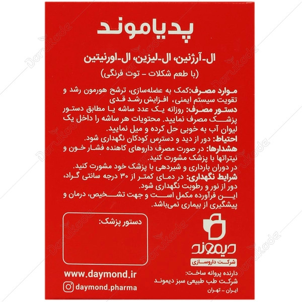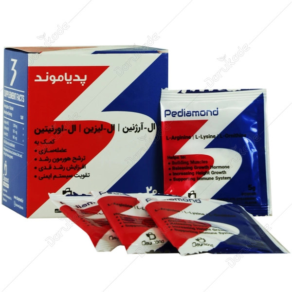 پودر پدیاموند، یک مکمل تغذیهای است که جهت کمک به بهبود عملکرد سیستم ایمنی، ساخت ماهیچه، آزادسازی هورمون رشد و افزایش قد فرموله شده است. پودر پدیاموند دارای آمینو اسیدهای ال آرژنین، ال لیزین و ال اورنیتین است. پدیاموند توسط شرکت طب طبیعی سبز دیموند، در ایران تولید میشود. این مکمل به فرم دارویی پودر بوده و در جعبه مقوایی به تعداد 20 ساشه به بازار عرضه میشود. پودر پدیاموند، با طعم دلپذیر توت فرنگی با شکلات موجود است.
