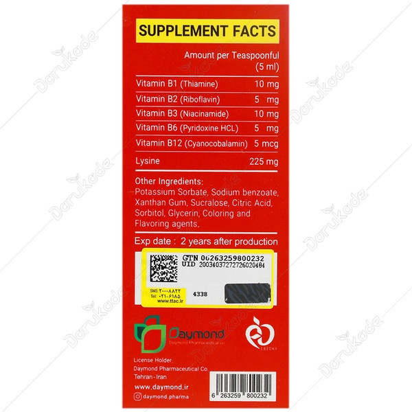 متابولیسم لیزین ارتباط نزدیکی با ویتامینهای گروه B دارد. از این رو در فرمولاسیون شربت پدیاموند از این گروه ویتامینها نیز استفاده شده است. از طرفی ویتامینهای گروه ب، خود نقش مهمی در متابولیسم انرژی، عملکرد شناختی، تنظیم اشتها و رشد کودک ایفا میکنند.