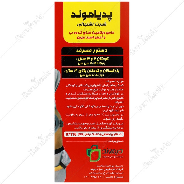 شربت پدیاموند محصولی از شرکت طب طبیعی سبز دیموند است که با آمینو اسید لیزین و ویتامینهای B6 ،B3 ،B2 ،B1 و B12 به منظور کمک به افزایش اشتها و وزنگیری و بهبود رشد کودک فرموله شده است.