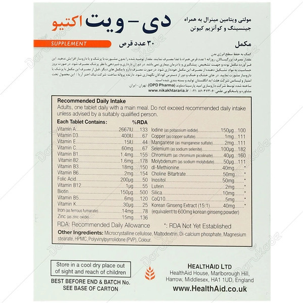 دی ویت اکتیو یک مکمل مولتی ویتامین مینرال است که حاوی طیف گستردهای از ریزمغذیها میباشد. دی ویت اکتیو با تامین ویتامینها، مواد معدنی، آنتیاکسیدانها، برخی آمینو اسید ها و عصاره جینسینگ در افزایش سطح انرژی روزانه، تقویت سیستم ایمنی، بهبود عملکرد ورزشی، تقویت بنیه و کاهش ضعف و خستگی جسمی موثر است. قرص دی ویت با فرمولاسیون ویژه جهت حفظ شادابی و سرزندگی در طول روز توسط شرکت نیک اختر آریا تحت برند هلث اید انگلستان در بستهبندی 30 عددی تولید شده است. اگرچه day vit active اساسا به فرم قرص طراحی و تولید شده است، با این وجود در بین عموم به عنوان ” کپسول دی ویت اکتیو" شناخته میشود؛ از همین رو ما نیز در متن شرح محصول گاها از این نام استفاده کردهایم.