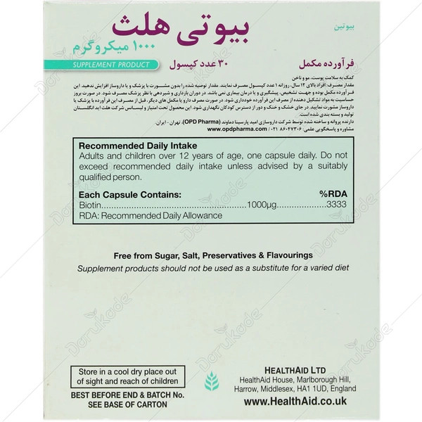 قرص بیوتی هلث تحت لیسانس شرکت هلث اید انگلستان است و در شرکت داروسازی امید پارسینا دماوند (OPD Pharma) در ایران تولید و بسته بندی شده است.