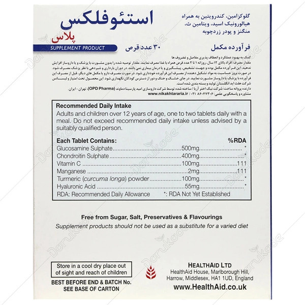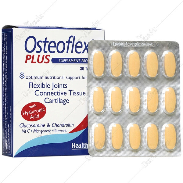 استئوفلکس پلاس، مکمل تغذیه ای به شکل دارویی قرص است که برای کمک به سلامت غضروف ها کاربرد دارد. استئوفلکس پلاس حاوی هیالورونیک اسید، گلوکزآمین، کندروئیتین، ویتامین C، منگنز و پودر زردچوبه است و علاوه بر بهبود عملکرد و انعطاف پذیری مفاصل و غضروف ها، به کاهش التهاب مفاصل، تسهیل تحرک و کاهش خشکی و درد مفاصل نیز کمک می کند. قرص Osteoflex Plus بدون شکر، نمک، نگهدارنده و طعم دهنده طراحی شده است و استفاده از آن در سنین بالای 12 سال امکان پذیر است. قرص استئوفلکس پلاس با برند هلث اید، در جعبه های مقوایی 30 عددی شامل 2 بلیستر 15 تایی، تحت لیسانس Health Aid انگلستان و توسط شرکت نیک اختر آریا در ایران تولید می شود.