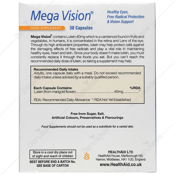 مگاویژن، مکمل تغذیه ای به شکل دارویی کپسول است و برای کمک به حفظ و ارتقاء سلامت چشم کاربرد دارد. مگاویژن، حاوی 40 میلی گرم لوتئین مشتق از گیاه گل همیشه بهار در هر کپسول است و علاوه بر کمک به سلامت چشم، در محافظت از چشم در برابر آسیب نور آبی و اشعه UV و همچنین محافظت از سلول های بینایی در برابر استرس اکسیداتیو نیز کمک کننده است. اگرچه مگا ویژن به شکل کپسول است، اما با نام قرص مگاویژن نیز شناخته می شود. کپسول مگا ویژن بدون شکر، نمک، رنگ مصنوعی، نگهدارنده و طعم دهنده طراحی شده است و از این نظر برای افراد حساس به هر کدام از این ترکیبات، قابل استفاده است. mega vision با برند هلث اید در جعبه های مقوایی 30 عددی حاوی 2 بلیستر 15 تایی تحت لیسانس هلث اید انگلستان و توسط OPD Pharma در ایران تولید می شود.