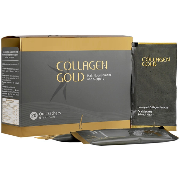 کلاژن گلد، پودر خوراکی تقویت مو به سفارش توسعه طب آدریان سلامت در جعبه های حاوی 20 ساشه 5 گرمی تولید و به بازار عرضه شده است. هر ساشه کلاژن گلد دارای کلاژن هیدرولیز شده، پروتئین کراتین، عصاره طبیعی گیاه بامبو و چند ماده مغذی دیگر برای تغذیه فولیکول های مو و بهبود رشد آن ها می باشد.