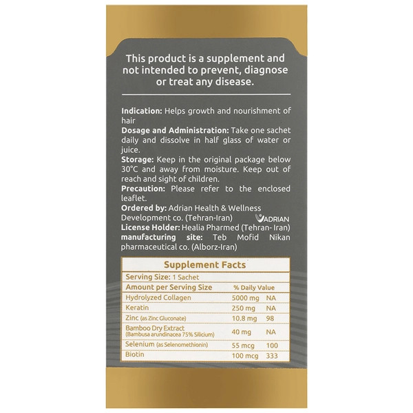 کلاژن گلد آدریان، با مجموعه ای از مواد مغذی شامل کلاژن هیدرولیز شده، پروتئین کراتین، عصاره گیاه بامبو در کنار ریزمغذی هایی از قبیل زینک، سلنیوم و بیوتین، موفق به تولید یک محصول تخصصی برای سلامت و تقویت موها شده است.