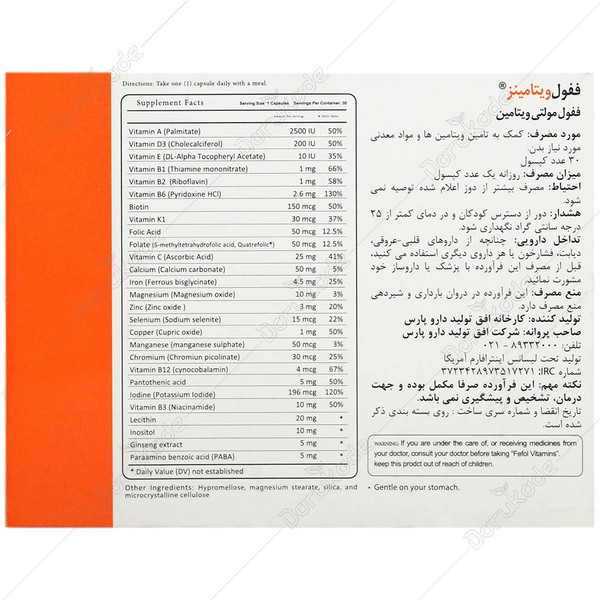 ففول ویتامینز تحت لیسانس شرکت اینترافارم آمریکا در ایران توسط شرکت افق تولید دارو پارس تولید میگردد. ففول ویتامینز به شکل کپسول و در بستهبندیهای 30 عددی (2 بلیستر 15تایی) تولید و به بازار دارویی عرضه شده است.