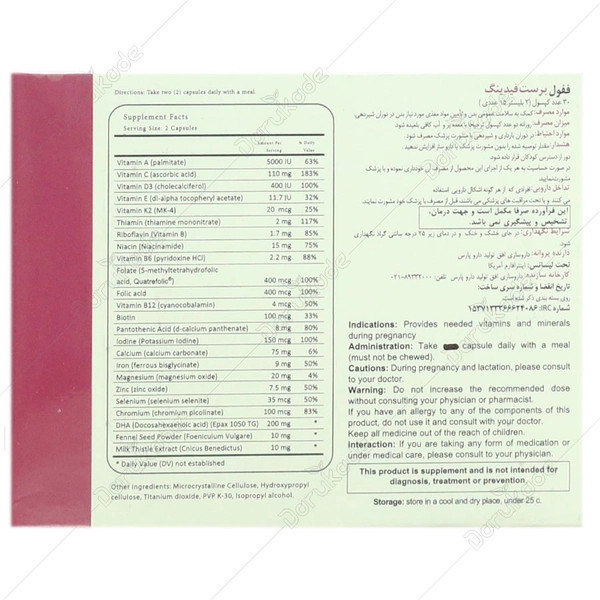 ففول برست فیدینگ مکمل تغذیه ای تخصصی دوران شیردهی، تحت لیسانس کمپانی اینترافارم آمریکا، در شرکت افق تولید دارو پارس در ایران تولید می گردد و با فرموله نمودن طیف گسترده ای از ویتامین ها، مواد معدنی، اسید چرب ضروری DHA و دو گیاه شیرافزای خار مریم و رازیانه، به تامین ریزمغذی ها و ارتقای سلامت مادر و شیرخوار کمک می کند. ففول برست فیدینگ به فرم دارویی کپسول و در جعبه های مقوایی 30 عددی (2 بلیستر 15 تایی) طراحی شده و در اصطلاح رایج به آن قرص برست فیدینگ نیز می گویند. در ادامه به هر دو شکل آن اشاره خواهیم کرد.