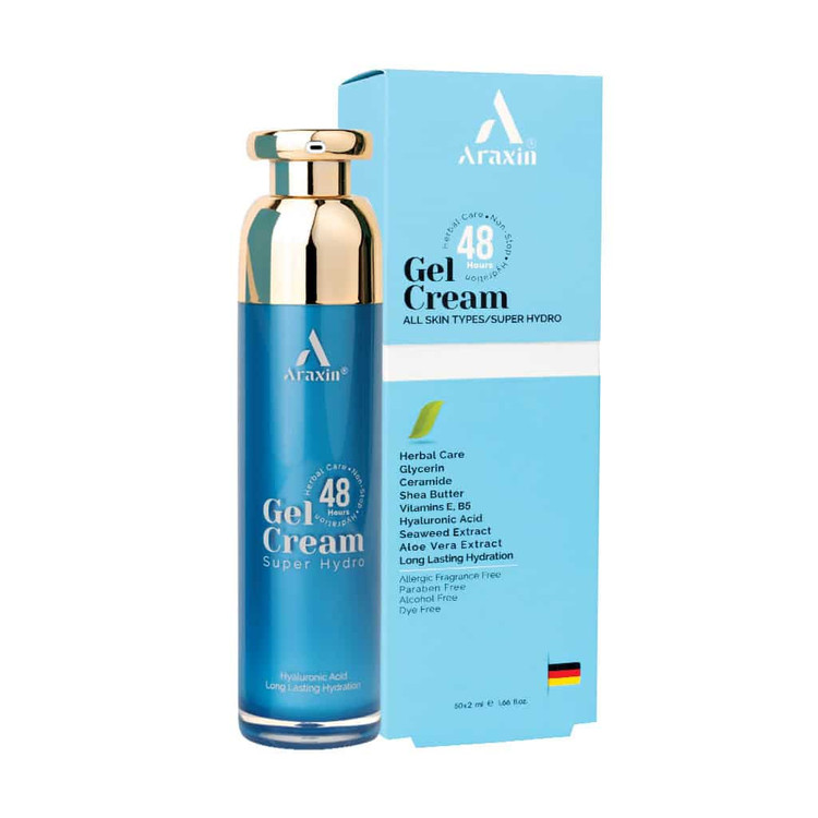 ژل کرم سوپر آبرسان گیاهی آراکسین حاوی آراکسین، هیالورونیک اسید، ساکران، دکسپنتنول، عصاره آلوئه ورا، شی باتر، اوره، توکوفرول و سرامید بوده و جهت آبرسانی و مرطوب نگه داشتن پوست با ماندگاری بالا طراحی شده است. این محصول با فرمولاسیونی سرشار از هیالورونیک اسید تا 48 ساعت پوست را به طور کامل آبرسانی کرده و آن را مرطوب نگه میدارد. این آبرسان پوست، حاوی عصاره جلبک دریایی ساکران و عصاره ارگانیک آلوئه ورا است که مملو از ویتامین، مواد معدنی و ترکیبات طبیعی بوده و به ترمیم شدن پوست کمک میکند.