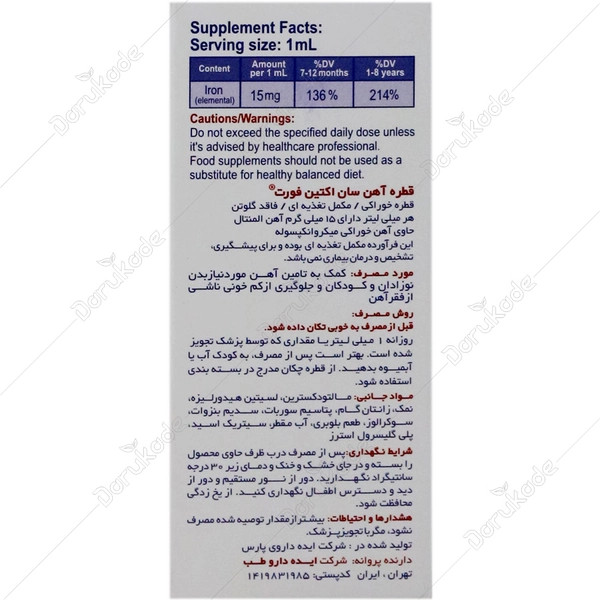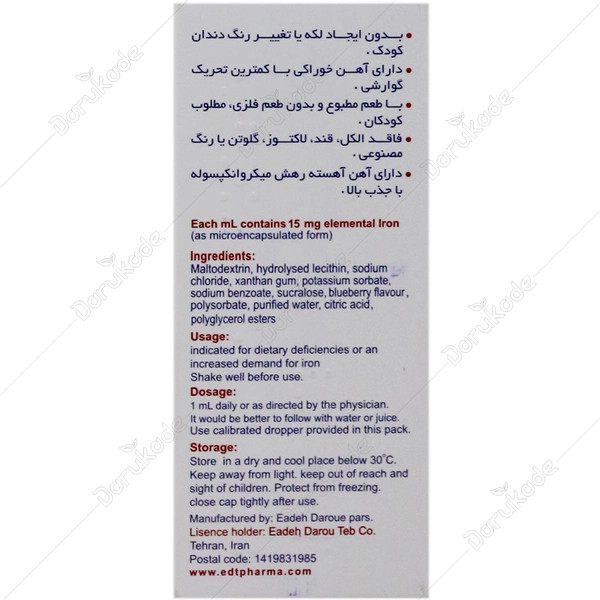 این محصول در هر میلی لیتر تامین کننده ی 15 میلی گرم آهن المنتال می باشد. این مکمل حاوی آهن خوراکی به فرم فریک پیرو فسفات میکروانکپسوله با جذب بالا و آهسته رهش می باشد.