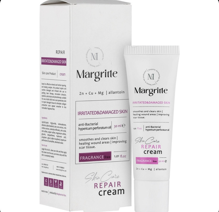 کرم ترمیم کننده مارگریت با داشتن ترکیبات مغذی و مفید مانند روی، مس، منیزیم، عصارههای گیاهی، کلاژن و آلانتوئین به بازسازی و ترمیم پوست آسیب دیده، خشکی و ترکهای پوست کمک میکند. وجود ترکیبات گیاهی مانند عصاره آلوئه ورا و روغن کالاندولا در ترکیبات این محصول باعث تسکین التهابات پوستی و حفظ رطوبت پوست میشود. این کرم فاقد اسانس بوده و از آن بعد از لیزر درمانی یا سایر درمانهای پوستی نیز استفاده میشود تا بهبود سریعتر پوست را تسهیل کند. خوشبختانه بافت سبک و غیرچرب این محصول سبب شده است که به سرعت جذب پوست شود. کرم ترمیم کننده پوست مارگریت در تیوپهای 30 میلی لیتری جهت استفاده روزانه به بازار عرضه میشود.