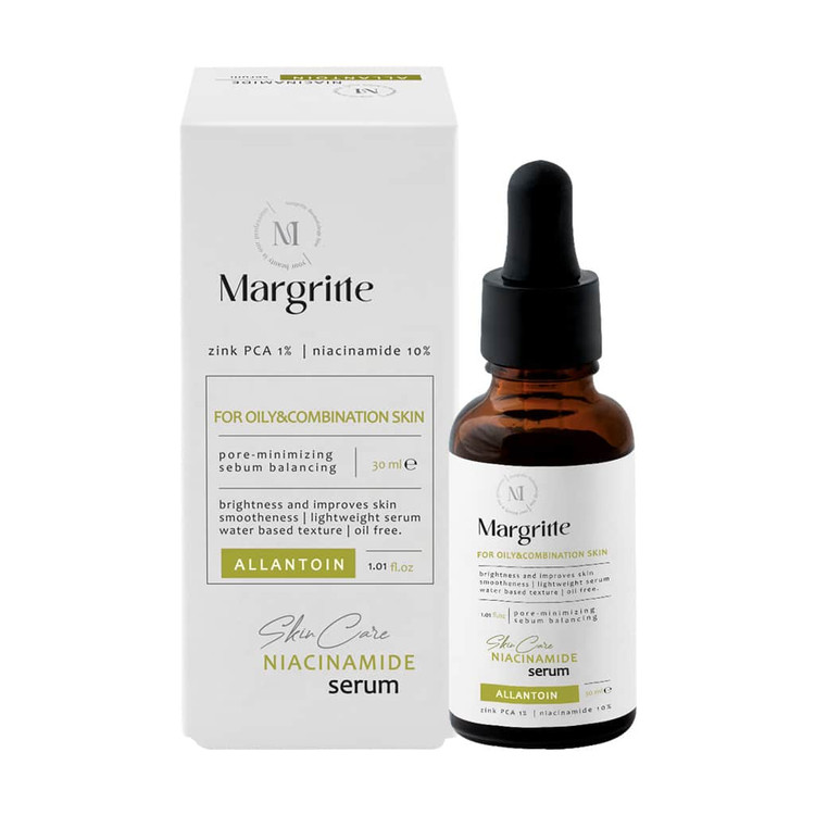 سرم نیاسینامید مارگریت حاوی ترکیبات موثری از جمله نیاسینامید و زینک بوده که یک گزینه مناسب برای افرادی است که پوست چرب و مختلطی دارند و به دنبال یک روش مناسب برای کاهش چربی، کوچک کردن منافذ و بهبود بافت پوست خود هستند. نیاسینامید موجود در این محصول به بهبود ظاهر پوست، کاهش قرمزی، کاهش منافذ باز و تنظیم تولید چربی کمک کرده و زینک نیز چربی اضافی پوست را کاهش میدهد. یکی از ترکبیات موثر موجود در این سرم، آلانتوئین بوده که باعث تسکین و ترمیم پوست شده و نرمی و لطافت را برای پوست شما به ارمغان میآورد.