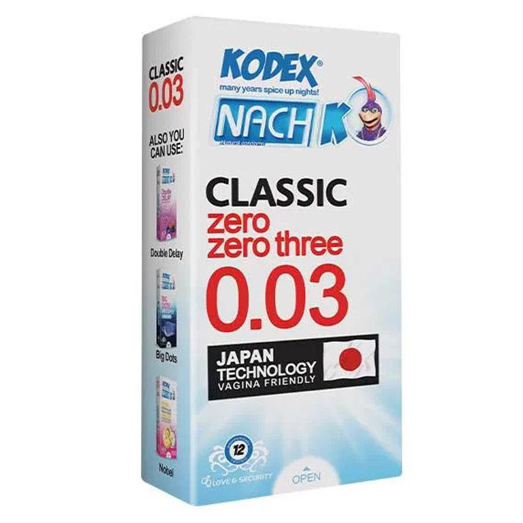کاندوم ناچ کدکس مدل بسیار نازک 30 میکرون دارای 12 عدد در هر بسته است که به دلیل داشتن لوبریکانت معظل درد حین آمیزش را برطرف می کند و لذت جنسی را در رابطه بالا می برد.