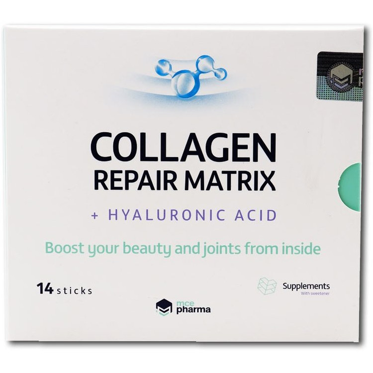 کلاژن ریپیر ماتریکس، مکملی به شکل پودر است که جهت کمک به بهبود قابلیت ارتجاعی و آبرسانی به پوست قابل استفاده است. کلاژن ریپیر ماتریکس حاوی کلاژن پپتید، هیالورونیک اسید، ویتامین C، زینک، سلنیوم و ریبوفلاوین یا ویتامین B2 است. برای این محصول 6 در 1، اثرات ضدپیری را نیز ذکر کرده اند. کلاژن ریپیر ماتریکس، بدون شکر افزوده است و همچنین حاوی محتوای فیبری بالایی است. collagen repair matrix با طعم مرکبات و همراه با شیرین کننده جهت کمک به پذیرش بهتر ارائه شده است. کلاژن ریپیر ماتریکس پلاس هیالورونیک اسید ام سی ای فارما، در جعبه مقوایی 70 گرمی شامل 14 استیک 5 گرمی تحت لیسانس mcePharma s.r.o جمهوری چک و توسط شرکت نوریا درمان پاسارگاد ایران تولید شده است.