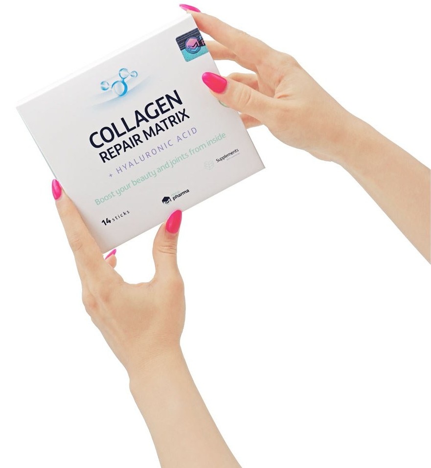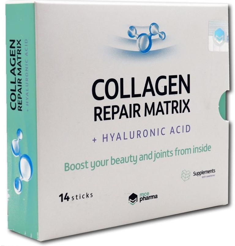 کلاژن ریپیر ماتریکس، مکملی به شکل پودر است که جهت کمک به بهبود قابلیت ارتجاعی و آبرسانی به پوست قابل استفاده است. کلاژن ریپیر ماتریکس حاوی کلاژن پپتید، هیالورونیک اسید، ویتامین C، زینک، سلنیوم و ریبوفلاوین یا ویتامین B2 است. برای این محصول 6 در 1، اثرات ضدپیری را نیز ذکر کرده اند. کلاژن ریپیر ماتریکس، بدون شکر افزوده است و همچنین حاوی محتوای فیبری بالایی است. collagen repair matrix با طعم مرکبات و همراه با شیرین کننده جهت کمک به پذیرش بهتر ارائه شده است. کلاژن ریپیر ماتریکس پلاس هیالورونیک اسید ام سی ای فارما، در جعبه مقوایی 70 گرمی شامل 14 استیک 5 گرمی تحت لیسانس mcePharma s.r.o جمهوری چک و توسط شرکت نوریا درمان پاسارگاد ایران تولید شده است.