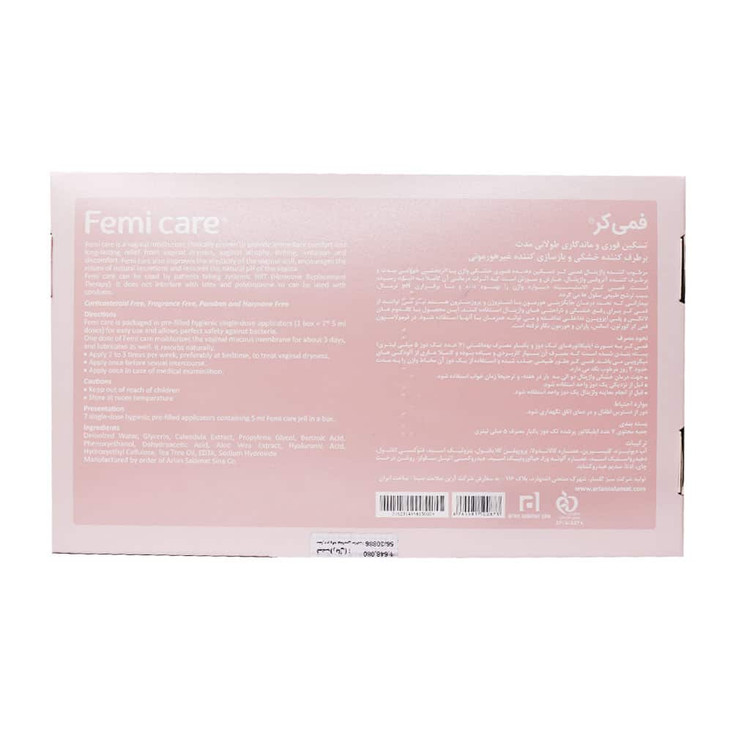ژل واژینال فمی کر آرین سلامت سینا تسکین دهنده فوری خشکی واژن با اثربخشی طولانی مدت و برطرف کننده آتروفی واژینال، خارش و سوزش است که اثرات درمانی آن کاملا به اثبات رسیده است. فمی کر الاستیسیته دیواره واژن را بهبود و با برقراری PH نرمال، سبب ترشح طبیعی سلولها میشود. بیمارانی که تحت درمان جایگزینی هورمون با استروژن و پروژسترون هستند نیز میتوانند از مرطوب کننده واژن فمی کر برای رفع خشکی و ناراحتیهای واژینال استفاده کنند.